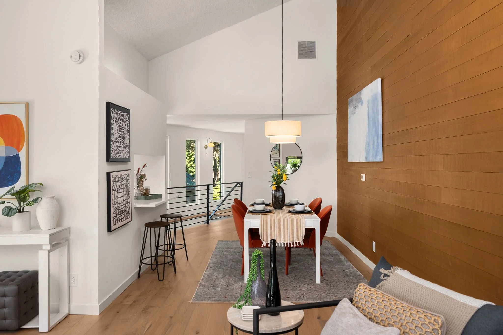 Warm wood cladding, carefully chosen to echo the home's original spirit, climbs the dramatic vaulted walls. The angles that once felt awkward became the whole point. Light pours in, the treetops frame every window like living art, and a space that once felt dated now feels like a deliberate, considered retreat.